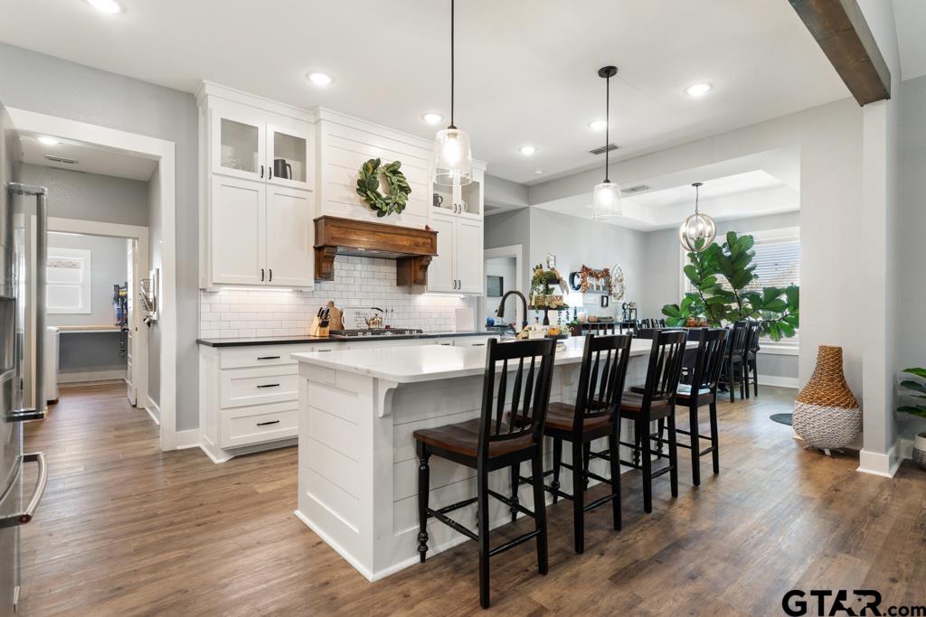 Stunning custom-built home in the highly sought-after Oak Creek subdivision! Nestled on a quiet cul-de-sac, this beautiful one-level home features 4 bedrooms, 3.5 baths, and 2,590 sq. ft. of well-designed living space with a split bedroom arrangement. The spacious living room offers vaulted ceilings, hand-scraped beams, floor to ceiling stone fireplace & large windows that fill the space with natural light. The open floor plan seamlessly connects the living, breakfast, & kitchen areas-perfect for both everyday living & entertaining. The kitchen features custom cabinetry, abundant counter space, & a breakfast area. A separate formal dining room (or second living area) adds versatility & style. Throughout the home, luxury vinyl flooring provides both elegance & durability. The primary suite is a relaxing retreat with tray ceilings, a spa-like ensuite bath featuring a free-standing garden tub, separate vanities, & a large walk-in closet. Three additional bedrooms offer ample space for family or guests, with well-appointed baths for convenience & comfort. Step outside to enjoy the oversized covered patio & private, fenced backyard-ideal for gatherings or quiet evenings. The property also includes an extra parking pad behind the fence, perfect for a boat or RV. Located close to schools, shopping, grocery stores, medical facilities, & just a short walk to Tyler Athletic & Swim Club. This home combines comfort, craftsmanship, & convenience-ready to welcome you home! | |