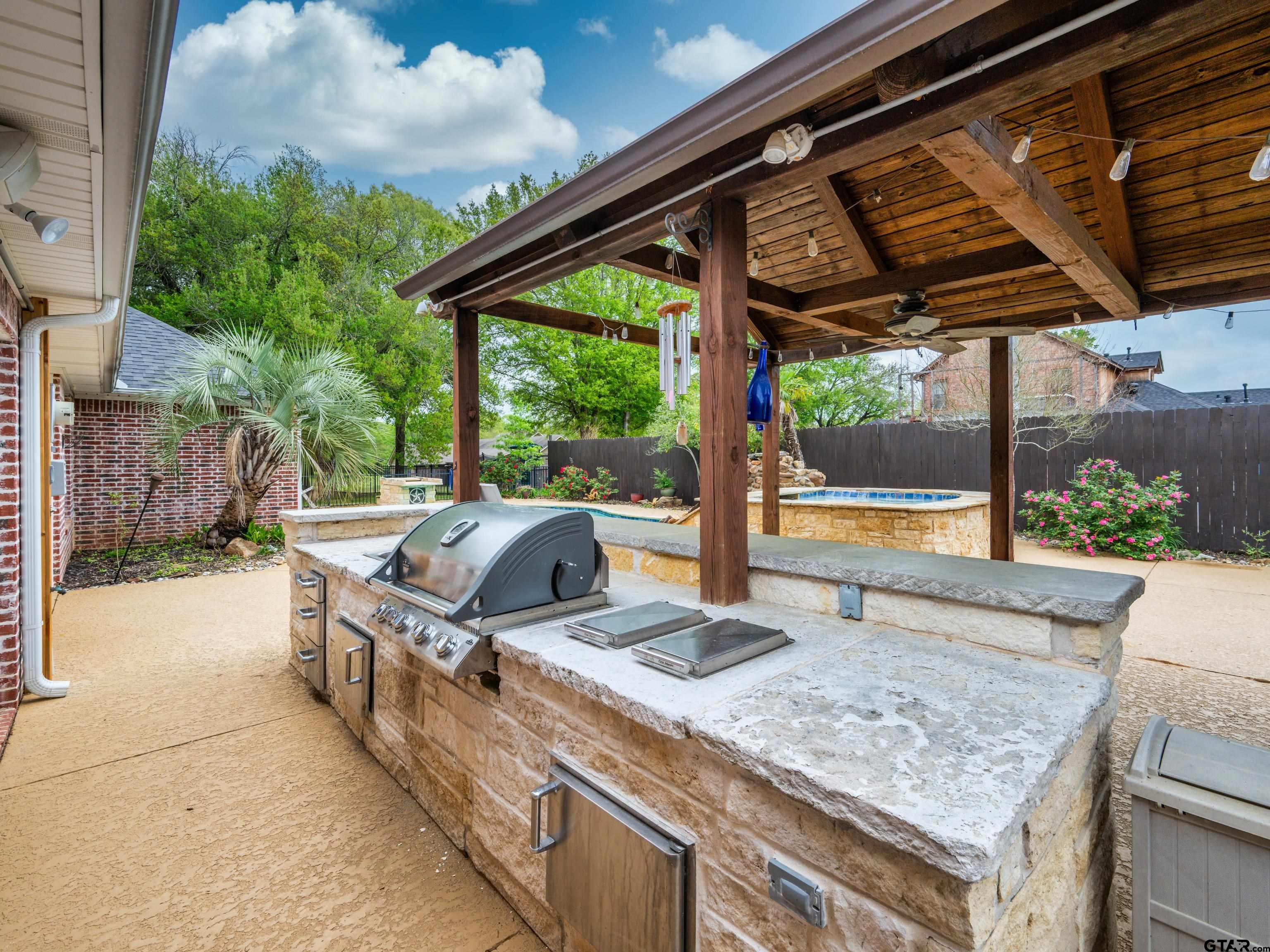 | Beautifully built and well-maintained custom home with brick and stone exterior located in The University Hills subdivision of Jacksonville. This 4 Bedroom, 3 Bath home includes over 2,800 square feet of living space and sits on approximately .49 acres. Great floor plan with a large living area moving into the open kitchen with a convenient bar top ideal for casual dining or entertaining guest attached dining room offers an elegant space for formal meals, making this home perfect for both everyday living and special occasions. You'll love the fireplace and custom trim work throughout this home. This home has a total of three bedrooms downstairs and the fourth large bedroom with its own bathroom upstairs. The Main Suite boast a private en-suite bath that has not only a shower but also a huge soaking tub and a walk-in closet with amazing built ins. The back yard is all about outdoor entertainment, featuring an outdoor kitchen with a stainless grill and two gas burners on the side, lots of countertop space, beautifully built cabana, outdoor fireplace with tv mounted above it, hot tub, gunite swimming pool and waterfalls at both ends of the pool that you can control from your cell phone. You'll also find extra storage with a wall of custom cabinets in the garage. | |